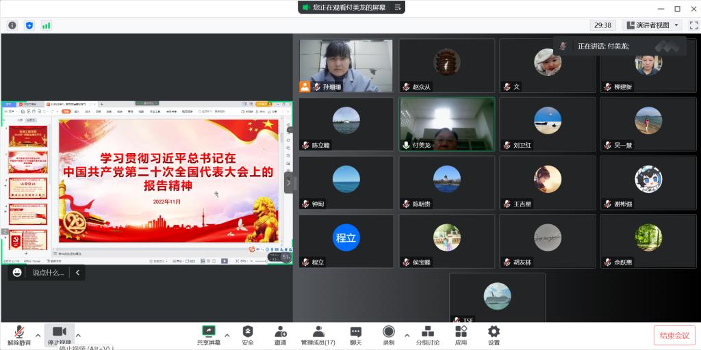 会上,各系集中学习了《习近平总书记在中国共产党第二十次全国代表大会上的报告》《中国共产党章程(修正案)》《十九届中央纪律检查委员会向中国共产党第二十次全国代表大会的工作报告》《习近平总书记在党的二十大闭幕会上的重要讲话精神》《习近平关于社会主义精神文明建设论述摘编》和《中共中央关于认真学习宣传贯彻党的二十大精神的决定》等重要内容。