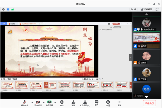 为了使全体员工党员能够更透彻而全面地理解中国制度的显著优势,张书记先后介绍分析了中国制度建设的历史进程、中国制度本身的内在逻辑、中国制度运行的支撑要素、制度优劣的评价标准、中国制度发展的前景,加深了参会党员对我国疫情中显现出的制度优势的理解与认识。