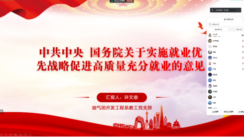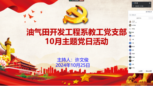 (通讯员:郝晨 许文俊)10月25日晚,油气田开发工程系教工党支部通过腾讯会议在线召开了以“党建引领,赋能就业,助力梦想启航”为主题的10月党日活动,活动由党支部书记许文俊同志主持。