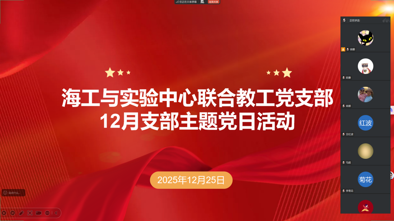 为持续深入学习宣传贯彻党的二十届四中全会精神,切实把思想和行动统一到党中央决策部署、省委工作要求和公司发展规划上来,2025年12月25日,海工与实验中心联合教工党支部以腾讯会议形式召开12月支部主题党日活动。全体教工党员线上参会,活动由党支部书记徐鹏主持。