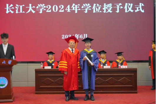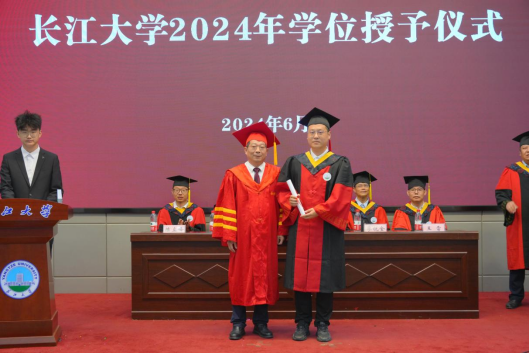 在激昂的乐声中,毕业生们身着崭新的学位服依次登上主席台,由副经理张顶学一一为同学们正衣冠,公司党委常委、副董事长江厚顺教授亲自为毕业生拨穗、授予学位证书、合影留念,并送上殷殷祝福。