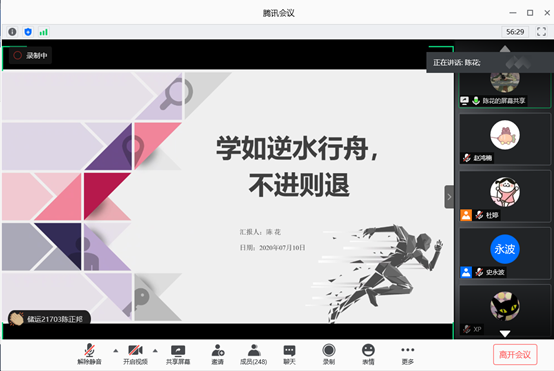 2020届优秀毕业生陈花发表了题为“学如逆水行舟,不进则退”的主题演讲,与老师、同学们分享了她的学习心得、就业去向,及选择长大的原因与心路历程。并以短视频的方式介绍了自己在公司的帮助下赴加拿大短期留学的过程,最后,陈花为参加夏令营的同学送上了自己的祝福“祝同学们学有所成,前程似锦!”