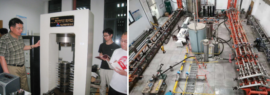 左图为楼一珊和员工们做科研,右图为廖锐全团队气举试验基地多相管流实验平台