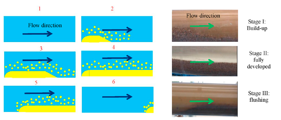 在上述模型基础上,针对复杂工况条件下的井眼清洁分析,智能钻井技术项目组开发出基于计算流体力学方法的动态井眼清洁模型,2020年在《SPE Journal》上发表 “Modeling of Dynamic Cuttings Transportation during Drilling of Oil and Gas Wells by Combining 2D CFD and 1D Discretization Approach”。该论文结合2D CFD和1D岩屑运移连续模型,利用2D CFD模拟井筒界面内的流动和悬浮岩屑分布,1D连续模型模拟岩屑在井筒轴向的移动,提出一种新的动态岩屑运移模型,模型计算结果与实验数据吻合较好。该方法克服传统模型在高流速条件下预测床高不足的缺点,能够用于局部复杂井眼的岩屑运移分析。
