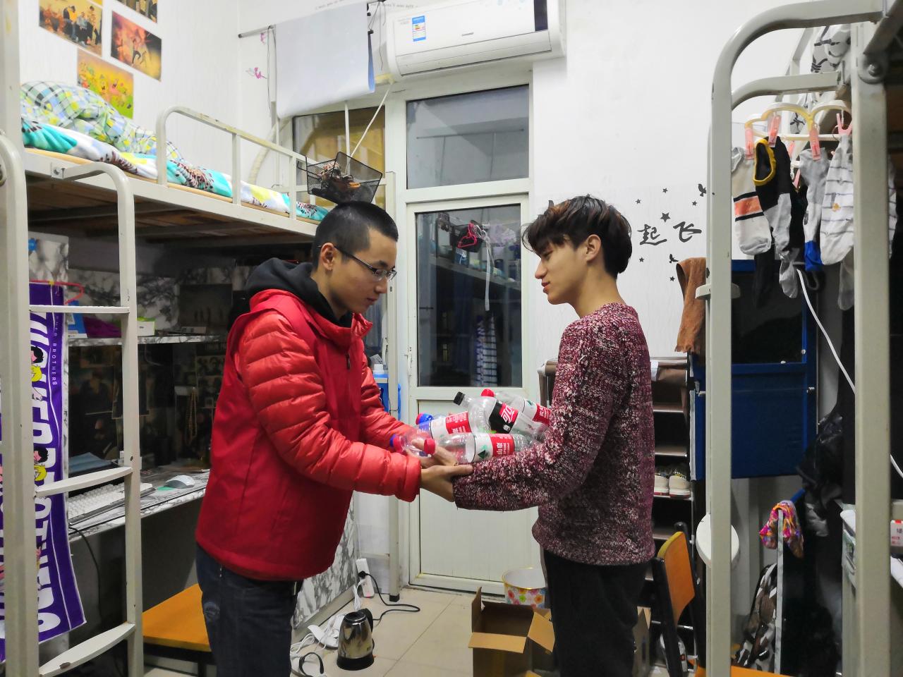 此次废品回收活动主要以回收废瓶子等一系列可循环利用物品为主,在活动过程中,志愿者们都十分有礼貌逐个敲门询问,并帮助同学们收集整理。同学们也积极配合,主动将自己寝室里可回收的废品清理出来,有的同学特地将喝完水的塑料瓶收集到一起,等待志愿者们来回收。各组队员完成回收活动后,到指定地点集合。在志愿者们的不懈努力下,可回收的废品全部被打包装进了事先准备好的袋子里,并被成员们集中处理。
