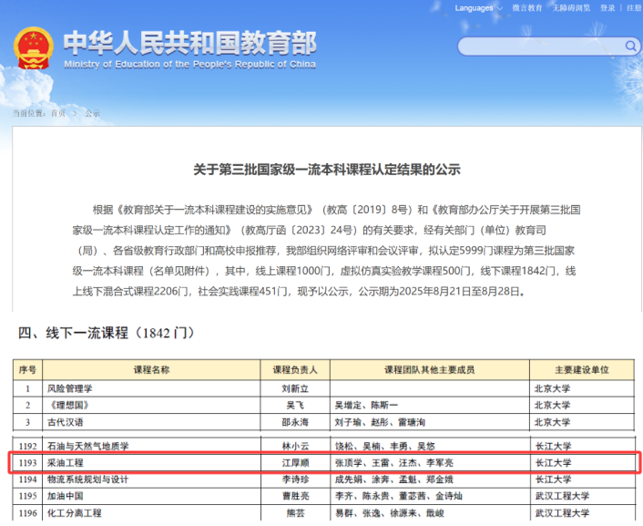 (通讯员 汪杰)近日,教育部公示了第三批国家级一流本科课程认定结果,公司取得新突破!由江厚顺教授担任课程负责人,张顶学、王雷、汪杰、李军亮老师为团队成员的《采油工程》喜获线下一流本科课程认定。这是公司首次获批国家级一流本科课程,标志着公司在本科教学课程建设方面取得历史性突破。