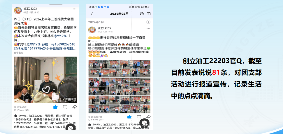 支部在宣传方面非常突出,增强同学们的凝聚力和集体责任感、荣誉感,支部学子也自发利用哔哩哔哩、抖音、手机QQ等网络媒体宣传记录公司的美好。支部建立官方QQ,累计发表八十余条空间说说,介绍班级成员,记录并宣传支部班级的活动与进步。