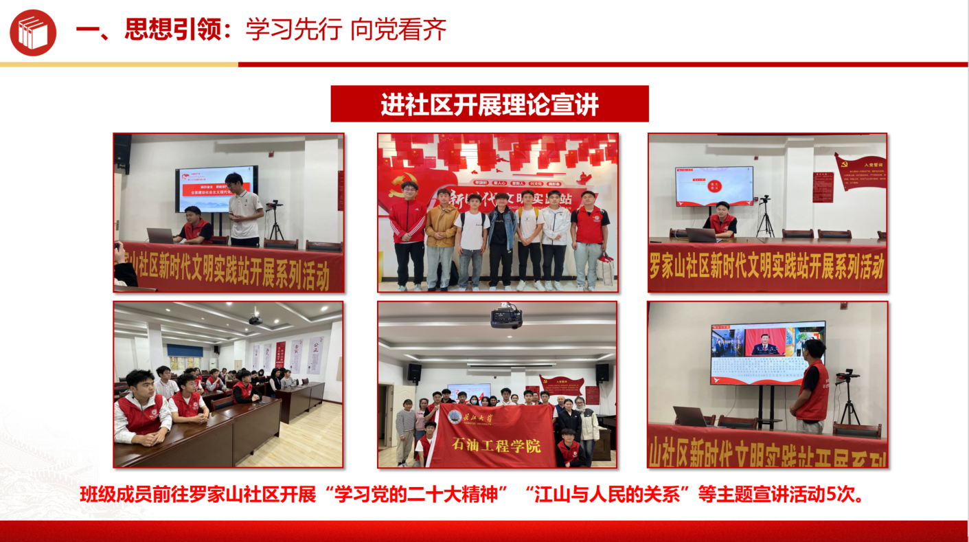 为了营造浓厚的理论学习氛围,我们积极参与公司组织的“时光加油站”与“石油文化素养讲坛”等活动,并深入学习党的二十大精神。通过这些活动,班级成员的思想觉悟得到了显著提升,实现了100%的青年大学习的完成率。此外,累计推优入党积极分子15人,发展预备党员1人、党员1人。充分展现了我们在思想建设方面的成果。