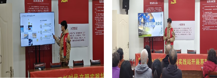 2025年4月9日,永利3044集团官网黑油能源科普宣讲队的队员前往罗家山社区开展能源科普宣讲活动。主讲人李富淼以身边的新能源为切入点,结合老年人日常场景,用通俗语言介绍光能(太阳能热水器、光伏路灯)、风能(小型风力发电原理)、水能(水力发电与家庭节水)的应用价值,然后结合国家基建,向老人们介绍我国在新能源领域建设的诸多成就和宏伟蓝图,最后以发展新能源的意义作结,引发了老人们的深深共鸣,青年智慧与银发经验碰撞,科技之力与人文关怀交融,这场“青绿对话”为社区可持续发展注入新活力。