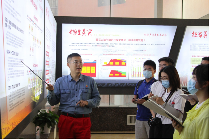 开发“稳产气”,心系“地方情”。在宣讲员的带领下,“黑油”实践队队员步入了英买油气田文化长廊。据英买油气田宣讲员郭俊介绍到:英买油气田的开发史就是一部滚动开发史!依靠英买油气田老区调整和新区滚动开发,实现了油气田的逐年增储、上产、稳产。正式投产以来,实现了天然气20亿立方,石油液体80万吨以上稳产8年的好成绩。“英买油气田始终与当地居民开展‘走亲戚式’的联络方式,每逢节假日‘串门’慰问。”宣讲员郭俊向“黑油”实践队队员介绍到。